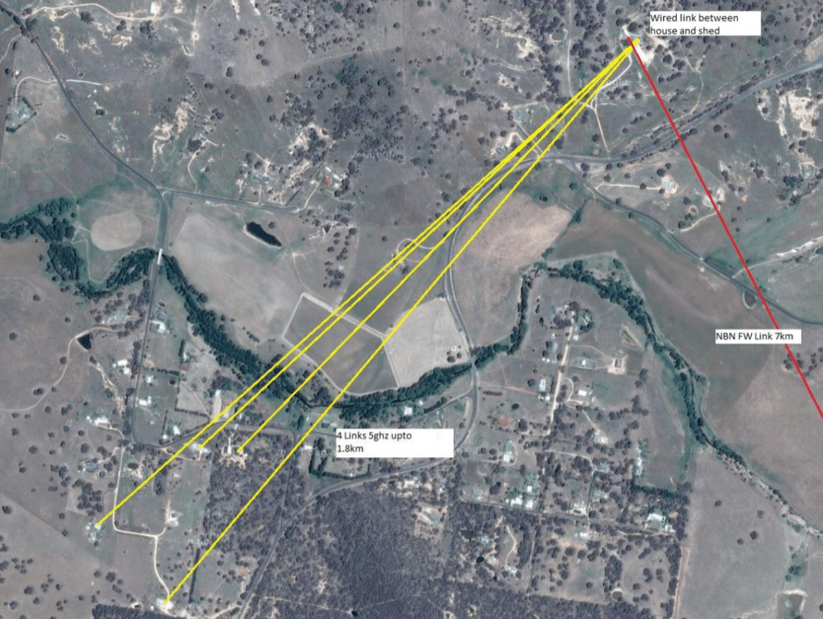 How to go about getting a link was to use about 2km Wi-Fi link from a neighbour that was within a NBN fixed wireless line of sight of tower, I had already a few years before I brought a box of 5 Ubiquiti Nanobridges (NB-5G22) while I was thinking about a long link intoBathurst.
