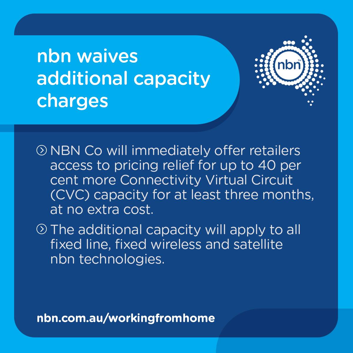 From Monday 23 March NBN Co will immediately offer internet providers access to pricing relief as required to help meet demand over time at no additional cost.