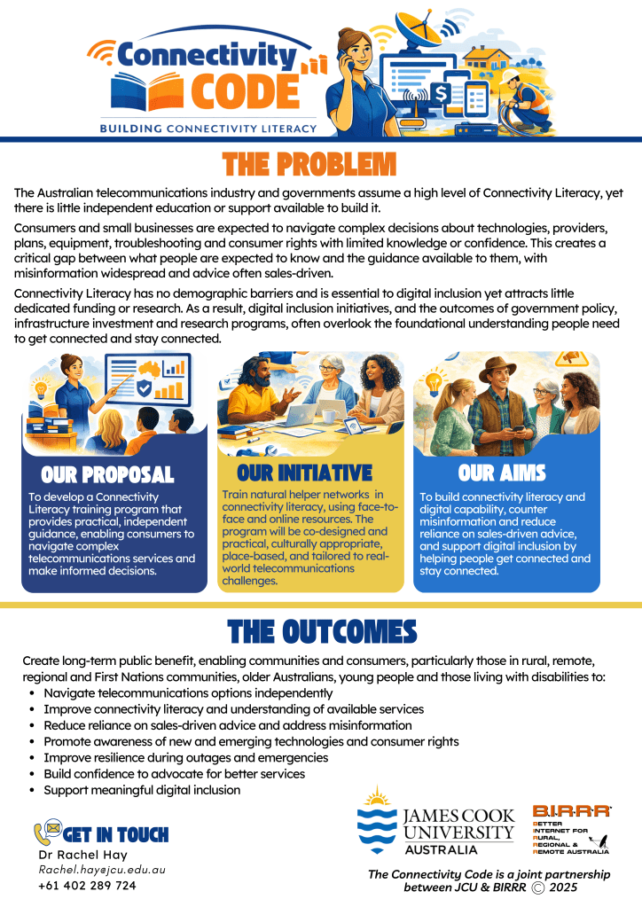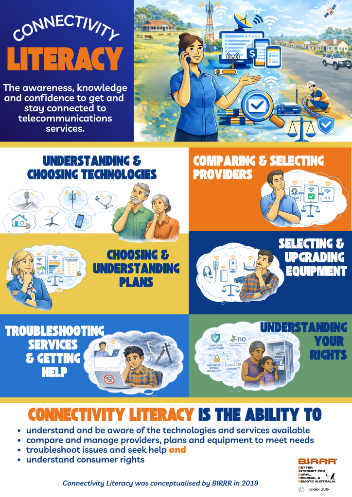 Many rural, regional, and remote (RRR) Australians are expected to navigate a complex telecommunications landscape just to get and stay connected. In 2019, Better Internet for Rural, Regional and Remote Australia (BIRRR) coined the term Connectivity Literacy to describe this burden.