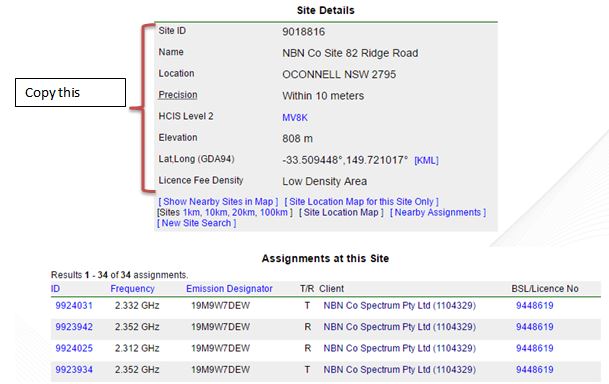 You may also get other towers listed if NBN is co-located with other services, also some Optus services are in the frequency range, make sure you check that the tower has NBN on it. Click on a Site where the T/R client column says T.